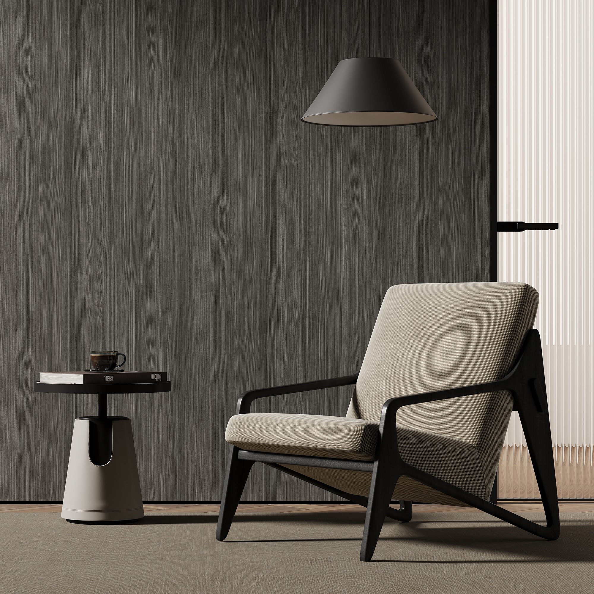 ES-531 to elegancki dekor o głębokiej, grafitowej tonacji z wyraźnym rysunkiem jesionu. Charakteryzuje się on bardzo gęstym i prostoliniowym układem usłojenia typu „edge grain”. Ciemna kolorystyka nadaje powierzchni zdecydowany, luksusowy charakter. Pomiędzy ciemnymi liniami prześwitują subtelne, jaśniejsze pasma naturalnego drewna. Taka kompozycja tworzy efekt trójwymiarowości oraz dużej głębi wizualnej. Z bliska widać precyzyjne pory drewna oraz delikatne przejścia tonalne. Z dystansu dekor prezentuje się jako spójna i szlachetna płaszczyzna. Jest to idealne rozwiązanie dla projektów wymagających elegancji i powagi.
